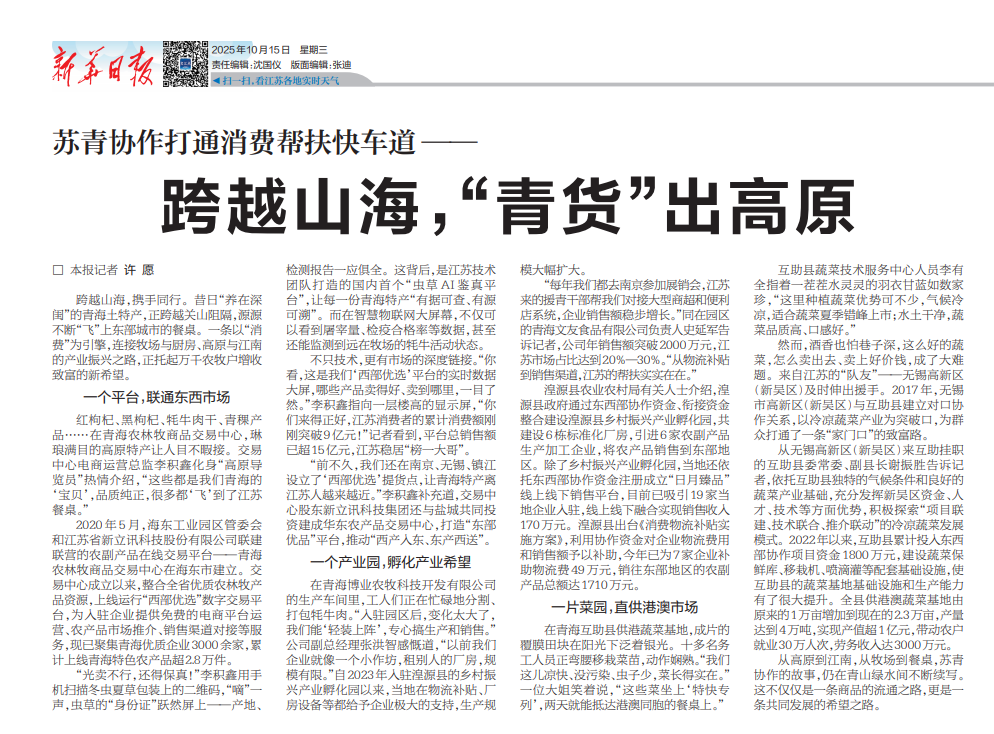 “前不久,我們還在南京、無錫、鎮(zhèn)江設(shè)立了‘西部?jī)?yōu)選’提貨點(diǎn),讓青海特產(chǎn)離江蘇人越來越近?!崩罘e鑫補(bǔ)充道,交易中心股東新立訊科技集團(tuán)還與鹽城共同投資建成華東農(nóng)產(chǎn)品交易中心,打造“東部?jī)?yōu)品”平臺(tái),推動(dòng)“西產(chǎn)入東、東產(chǎn)西送”。