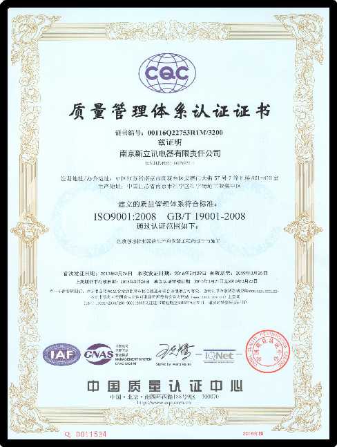 質量管理體系的建立和貫徹運行,將有助于新立訊完善管理流程,提高運營效率,也為進一步的市場開拓提供了強有力的支撐,同時綜合提升新立訊企業(yè)整體形象及核心競爭力。至此,新立訊企業(yè)主要經營項,均通過ISO質量體系認證。