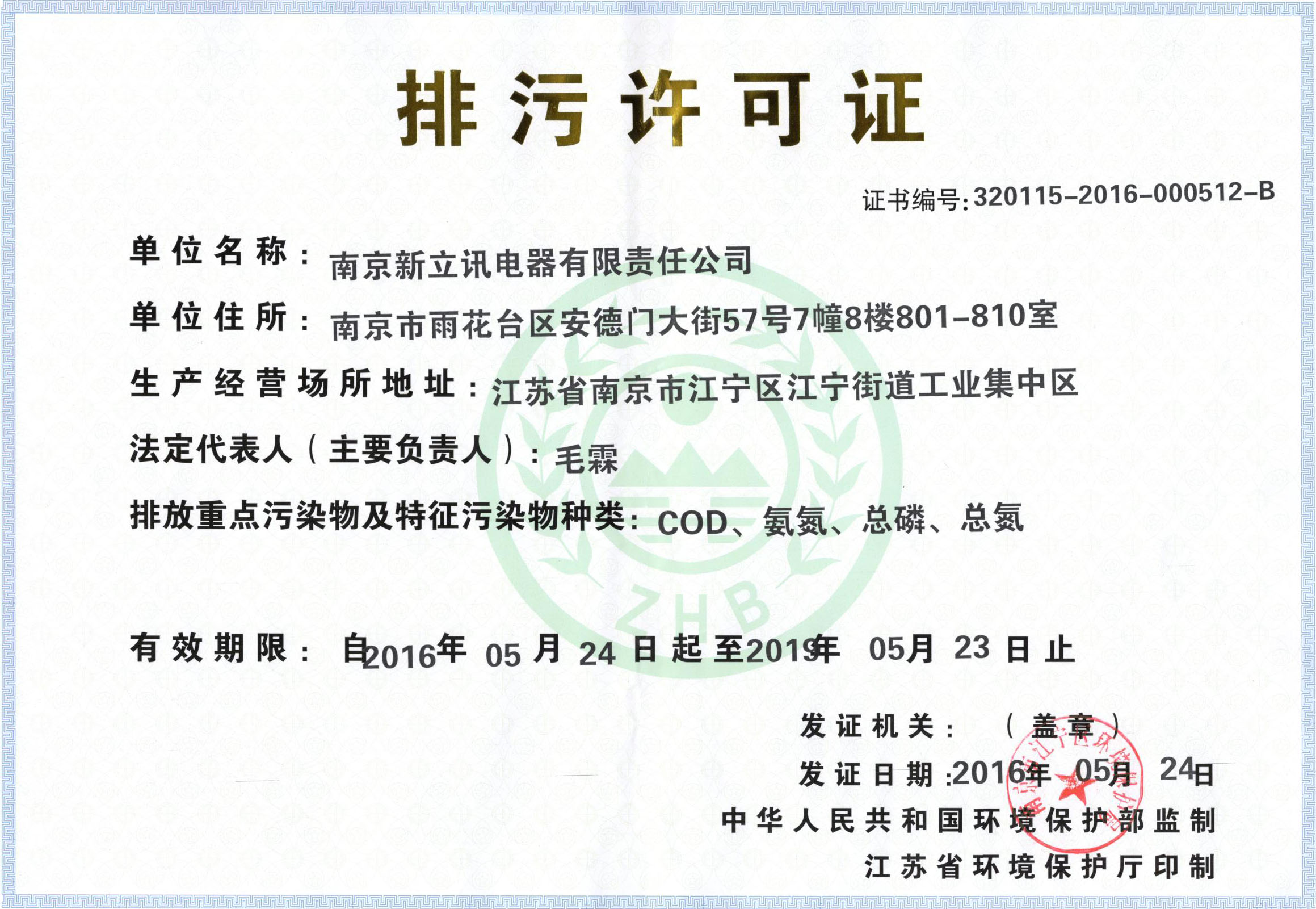 2016年5月24日,南京新立訊電器有限責(zé)任公司獲得江蘇省環(huán)境保護(hù)廳頒發(fā)的最新版排污許可證。南京新立訊電器有限責(zé)任公司成立以來(lái),領(lǐng)導(dǎo)班子高度重視環(huán)境保護(hù)工作,多次就環(huán)保驗(yàn)收及排污許可證的取得等事宜進(jìn)行安排部署,極大地促進(jìn)此項(xiàng)工作的完成。