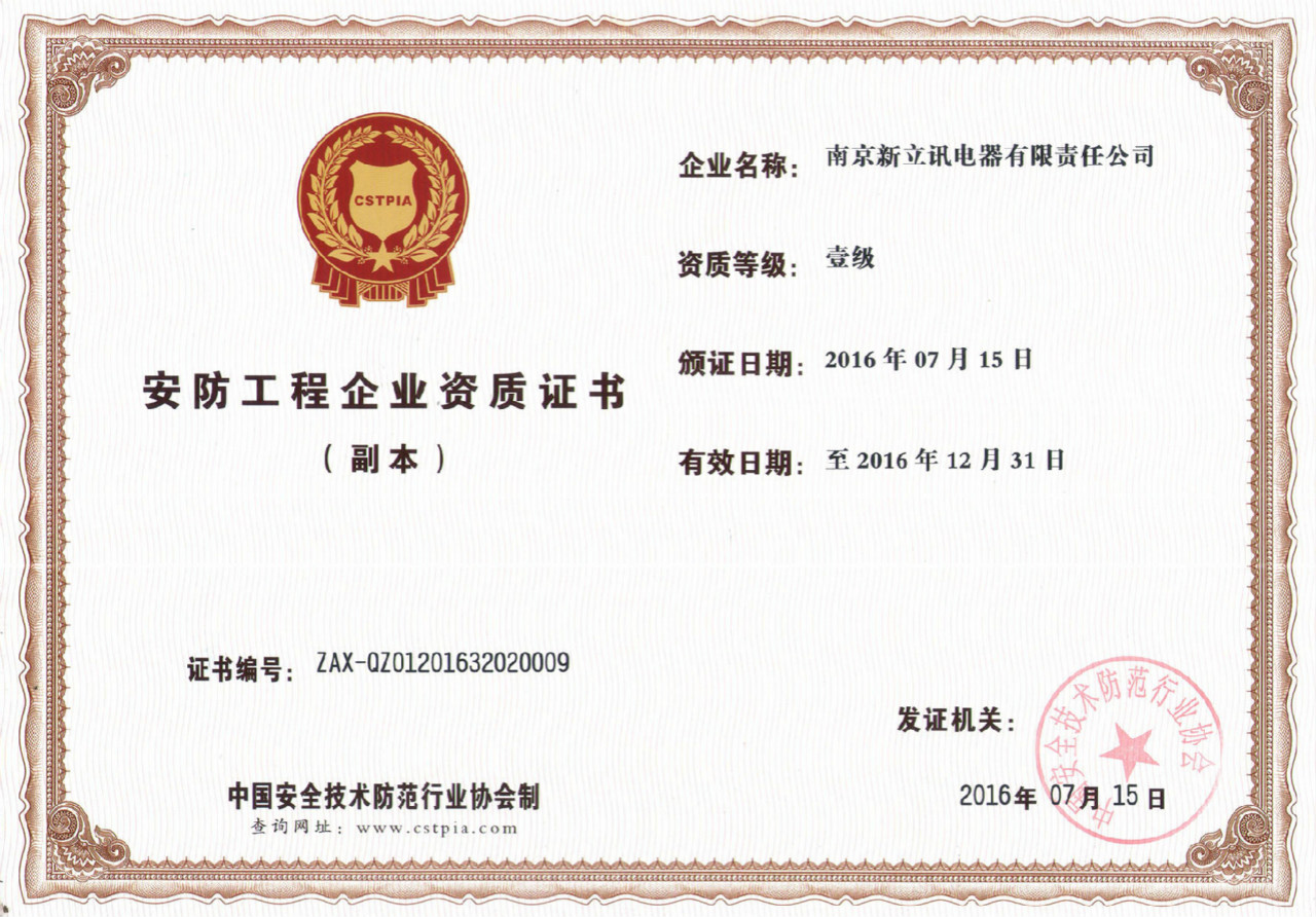(新立訊公司于2013年、2014年、2015年、2016年獲江蘇省公安廳安全技術(shù)防范辦公室頒發(fā)安防工程設(shè)計施工一級資質(zhì)證明。)