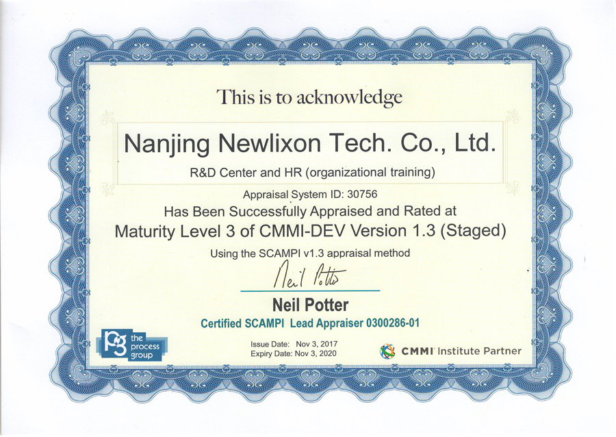 2017年11月3日,在公司會議室舉行的CMMI3級認證結果發(fā)布會上,CMMI研究所外籍主任評估師Neil Potter向公司高層和參與的評估項目組成員正式宣布:經(jīng)過嚴格的一周現(xiàn)場審核和評估,南京新立訊科技股份有限公司已經(jīng)達到軟件成熟度CMMI 3級,成功通過CMMI 3級認證。這標志著南京新立訊在軟件研發(fā)標準化流程、過程改進、項目管理等方面達到先進水平,可為國內外客戶提供更高技術水平、更高質量的軟件開發(fā)整體服務。
