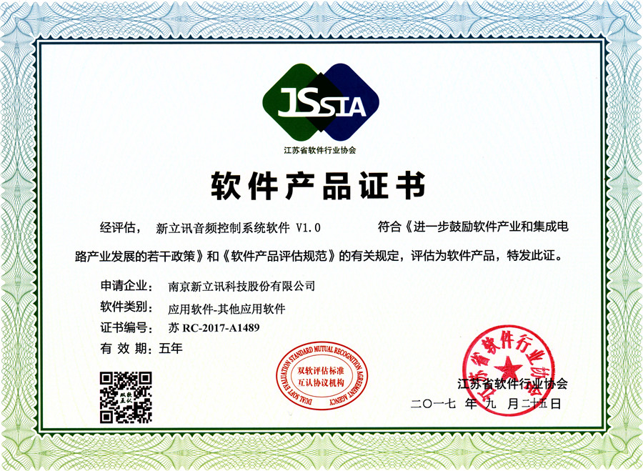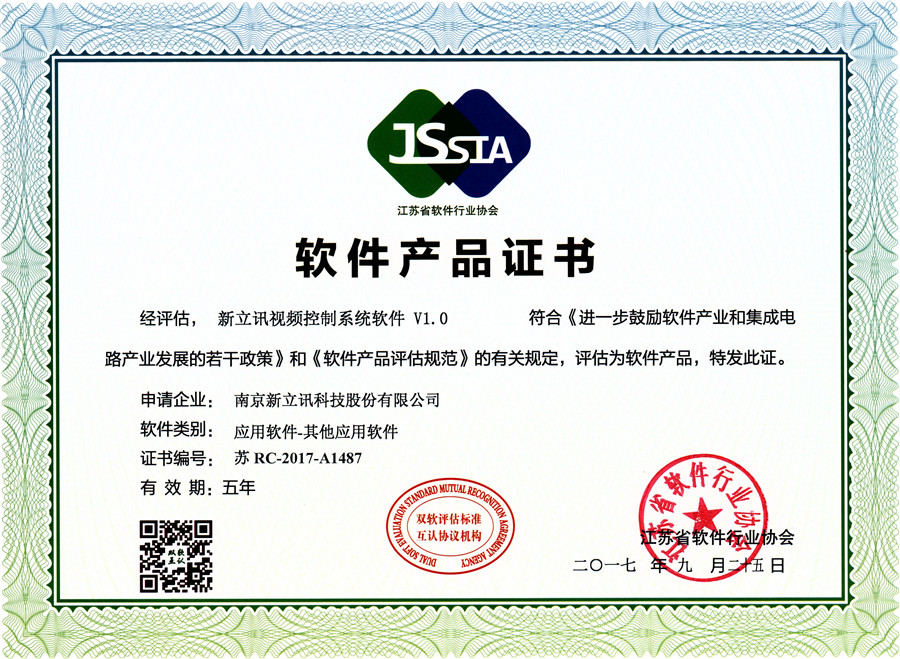 經(jīng)江蘇省軟件行業(yè)協(xié)會(huì)的嚴(yán)格審核,南京新立訊公司符合《進(jìn)一步鼓勵(lì)軟件產(chǎn)業(yè)和集成電路產(chǎn)業(yè)發(fā)展的若干政策》和《軟件企業(yè)評(píng)估規(guī)范》的有關(guān)規(guī)定,被認(rèn)定為軟件企業(yè)。目前我司擁有知識(shí)產(chǎn)權(quán)67項(xiàng),軟件產(chǎn)品證書(shū)9項(xiàng),其中3項(xiàng)分別為新立訊視頻控制系統(tǒng)軟件V1.0(證書(shū)編號(hào):蘇RC-2017-A1487)、新立訊3D實(shí)景綜合控制平臺(tái)系統(tǒng)軟件V1.0(證書(shū)編號(hào):蘇RC-2017-A1488)和新立訊音頻控制系統(tǒng)軟件V1.0(證書(shū)編號(hào):蘇RC-2017-A1489)。