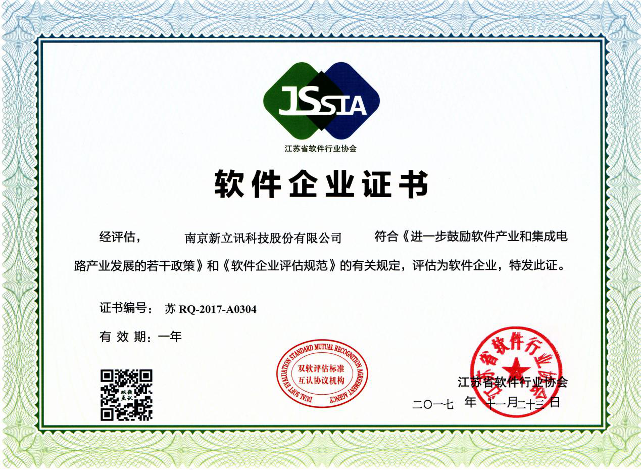 南京新立訊科技股份有限公司于近日獲得江蘇省軟件行業(yè)協(xié)會(huì)頒發(fā)《軟件企業(yè)認(rèn)定證書(shū)》,證書(shū)編號(hào):蘇 RQ-2017-A0304,發(fā)證日期為2017年11月23日。