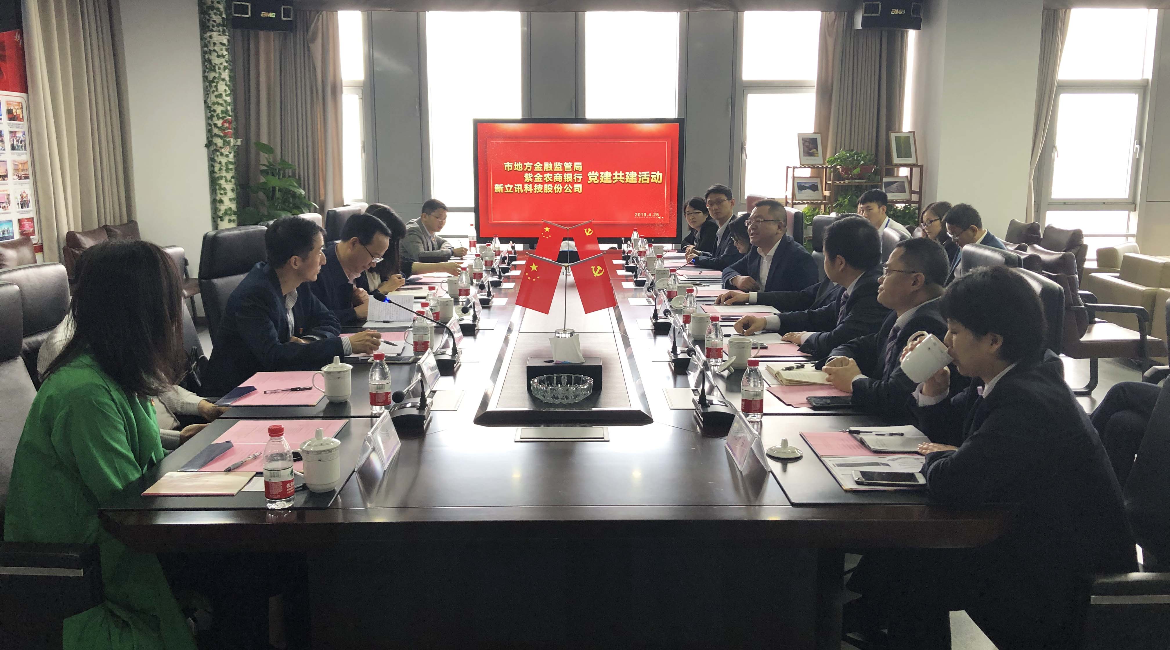 2019年4月25日,南京市地方金融監(jiān)管局、紫金農(nóng)商銀行與南京新立訊科技股份有限公司共同在新立訊總部開展黨建共建活動。金融監(jiān)管局黨組書記、局長劉永彪,紫金農(nóng)商銀行黨委副書記王留平;中國(南京)軟件谷高新局局長吳瑩;新立訊董事長毛霖、公司高管層及各方黨員代表等共同參與此次黨建活動。共建活動由新立訊黨支部書記、副總經(jīng)理李偉主持。