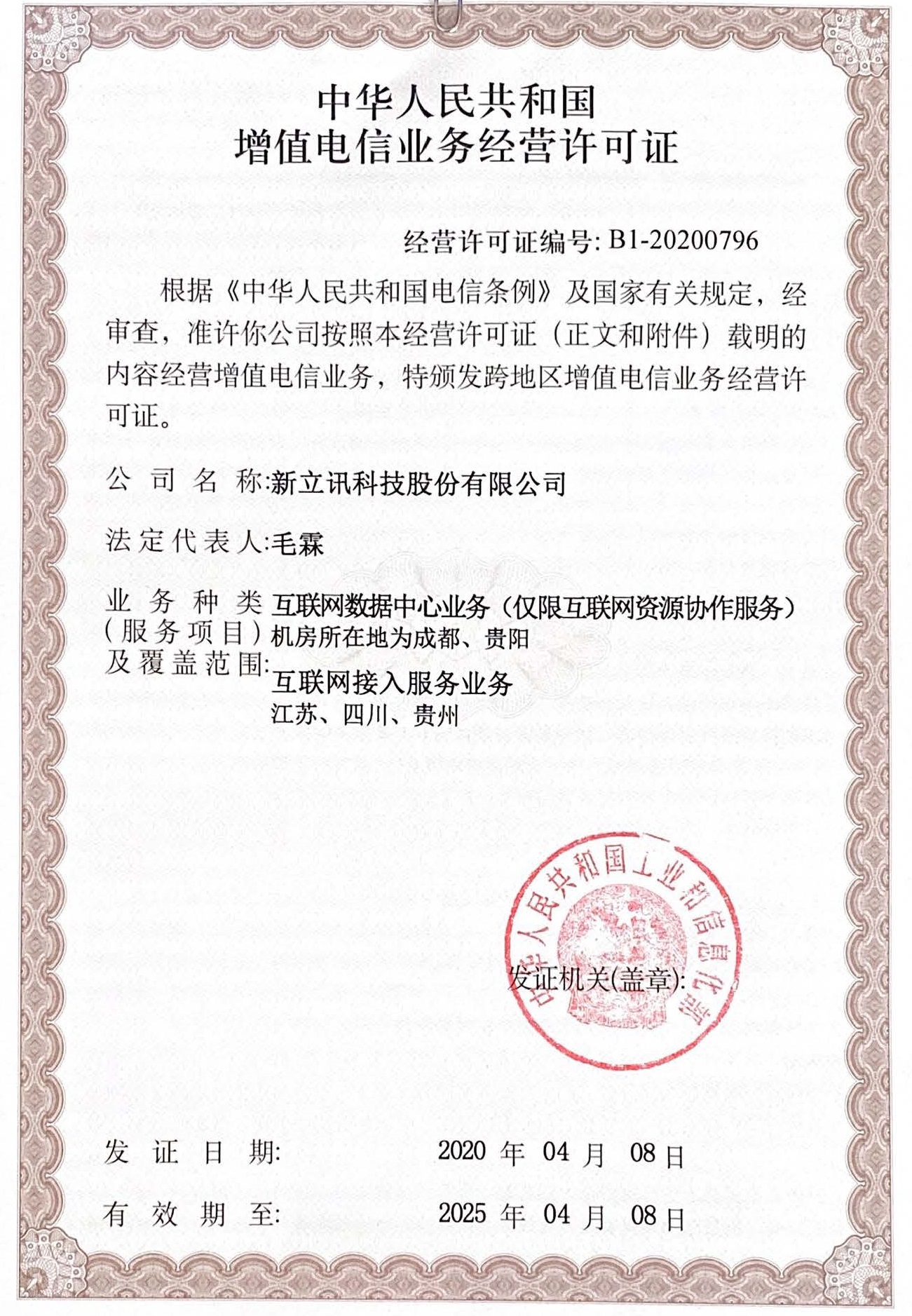 新立訊公司現(xiàn)已累計獲得:互聯(lián)網(wǎng)信息服務業(yè)務、互聯(lián)網(wǎng)接入服務(ISP)業(yè)務、互聯(lián)網(wǎng)數(shù)據(jù)中心業(yè)務(IDC)增值電信牌照。實現(xiàn)較為完善互聯(lián)網(wǎng)數(shù)據(jù)中心布局,本次取得新的業(yè)務經(jīng)營許可證是相關行業(yè)監(jiān)管部門對新立訊近年來業(yè)務經(jīng)營能力及成果的充分肯定,也是新立訊業(yè)務擴張策略和企業(yè)轉型布局的重要體現(xiàn),是新立訊又一重要里程碑時刻。今后,新立訊將繼續(xù)秉承“服務社會、創(chuàng)造價值”的企業(yè)使命,積極創(chuàng)新,不斷為客戶提供更專業(yè)、穩(wěn)健、高效的綜合數(shù)據(jù)業(yè)務,服務國家戰(zhàn)略“新基建”建設。