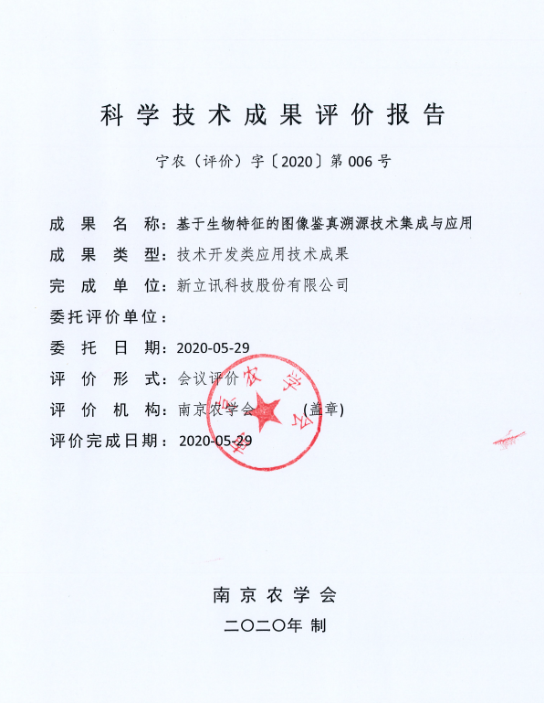 近日,新立訊科技股份有限公司自主研發(fā)的基于AI生物特征的圖像鑒真溯源技術集成與應用取得由專業(yè)評審機構南京農學會組織的《科學技術成果評價》,技術先進性達國內外領先水平。