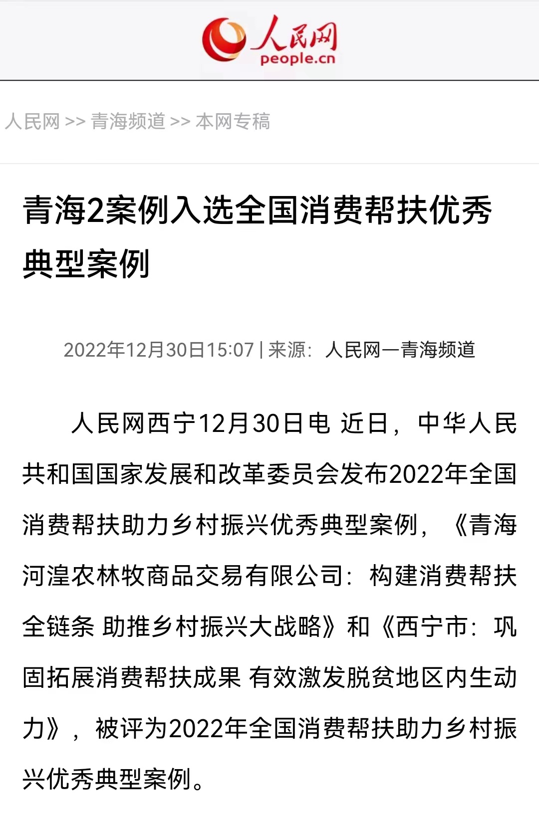 人民網(wǎng)西寧12月30日電 近日,中華人民共和國國家發(fā)展和改革委員會發(fā)布2022年全國消費(fèi)幫扶助力鄉(xiāng)村振興優(yōu)秀典型案例,《青海河湟農(nóng)林牧商品交易有限公司(青海農(nóng)林牧商品交易中心):構(gòu)建消費(fèi)幫扶全鏈條 助推鄉(xiāng)村振興大戰(zhàn)略》被評為2022年全國消費(fèi)幫扶助力鄉(xiāng)村振興優(yōu)秀典型案例。