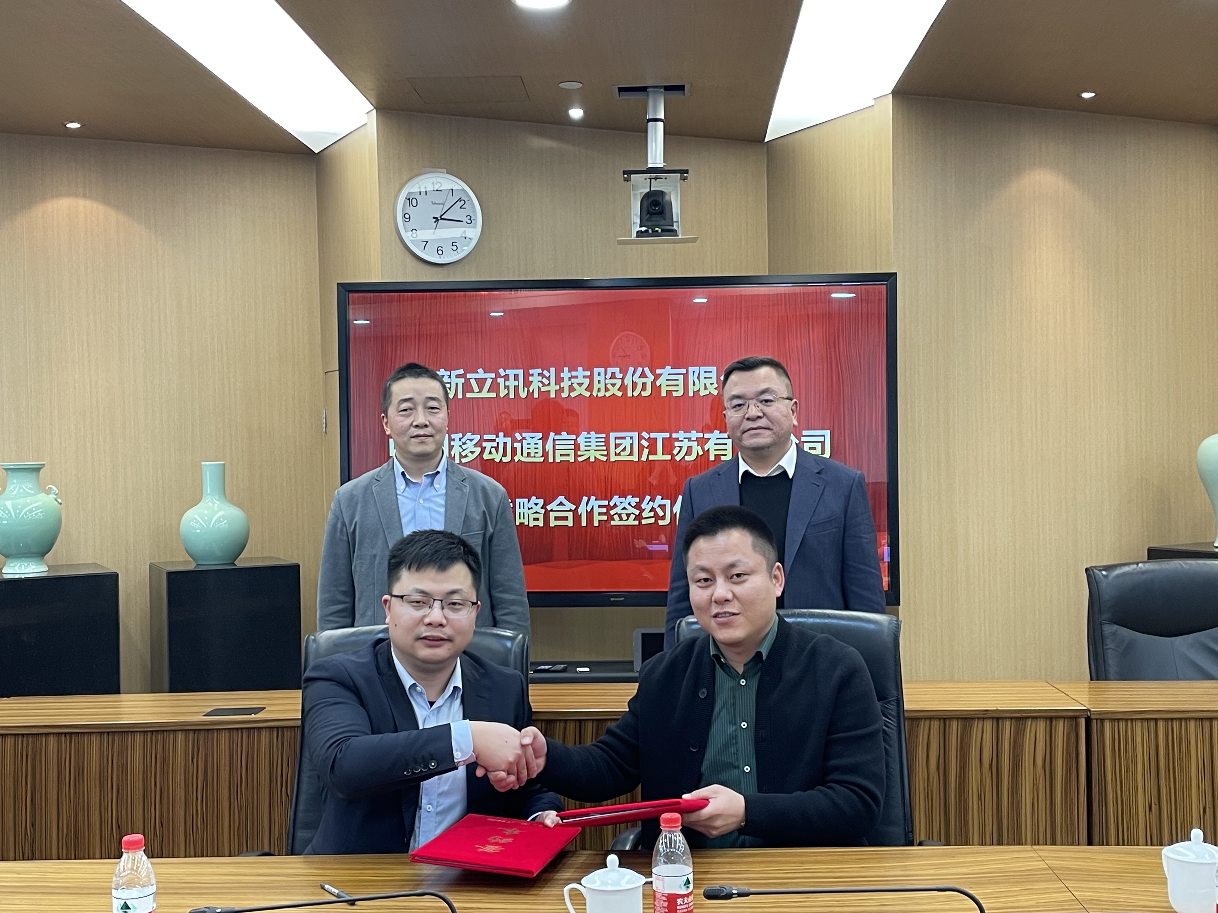 2024年1月25日,新立訊與中國(guó)移動(dòng)通信集團(tuán)江蘇有限公司在省移動(dòng)大樓913會(huì)議室舉行戰(zhàn)略合作簽約儀式。中國(guó)移動(dòng)通信集團(tuán)江蘇有限公司省政企客戶中心副總經(jīng)理陸辰飛,省集團(tuán)客戶部行業(yè)應(yīng)用中心總經(jīng)理卜榮勝,南京移動(dòng)集團(tuán)客戶部總經(jīng)理蔡璨,雨花臺(tái)移動(dòng)總經(jīng)理許文博等移動(dòng)公司代表出席。新立訊董事長(zhǎng)兼總經(jīng)理毛霖?cái)y財(cái)務(wù)總監(jiān)彭亮,華東事業(yè)部總經(jīng)理陳凱,西北事業(yè)部總經(jīng)理?xiàng)顥畹裙芾韺映鱿灱s。